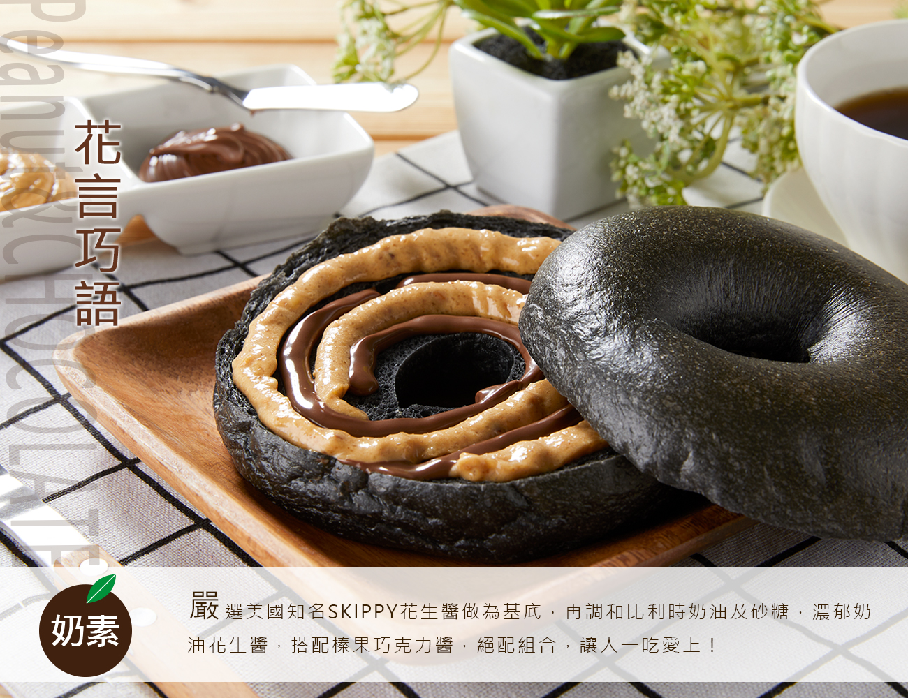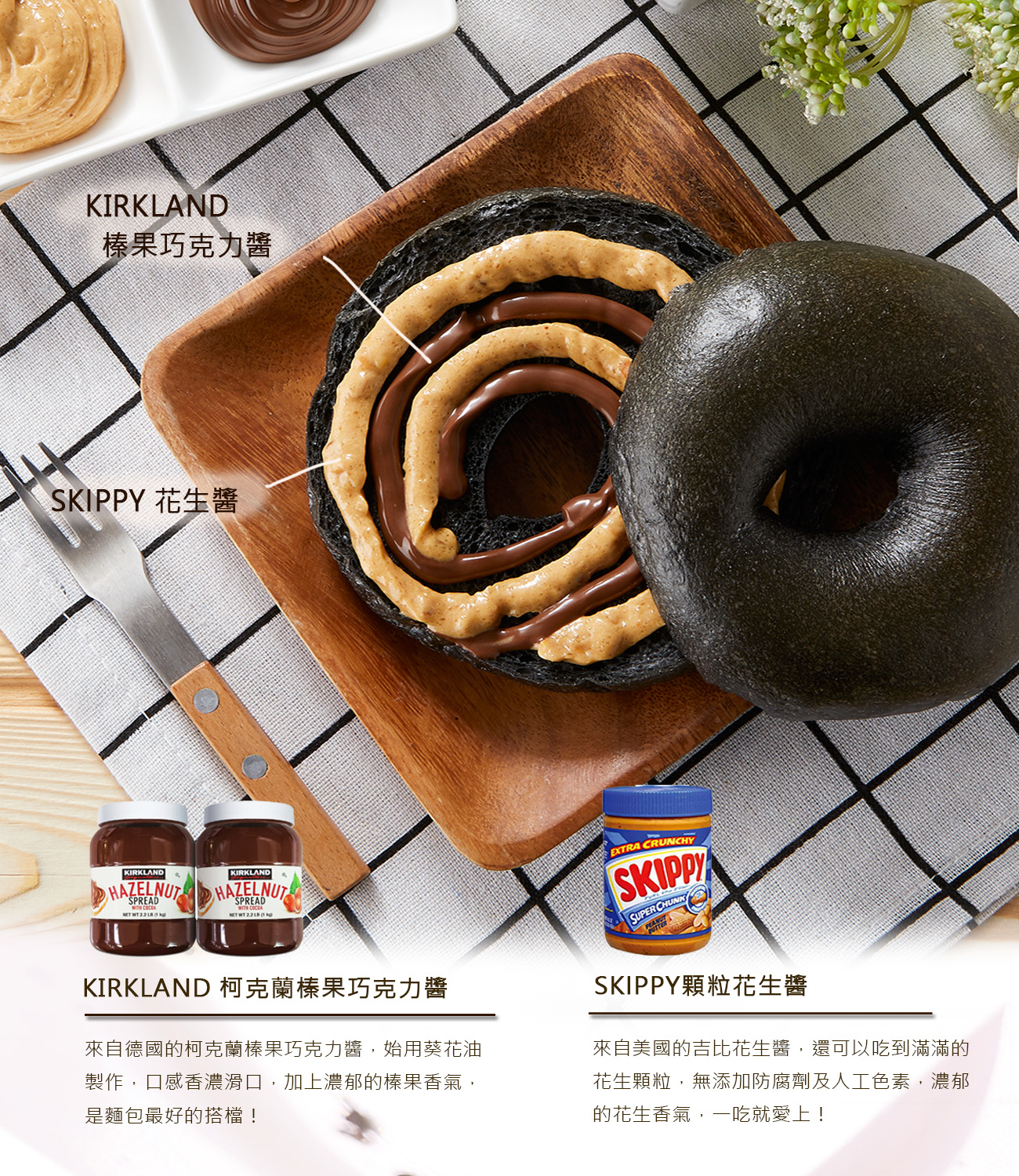 成分|麵粉、竹炭粉、酵母、水、奶油、糖、鹽、花生醬、榛果巧克力醬