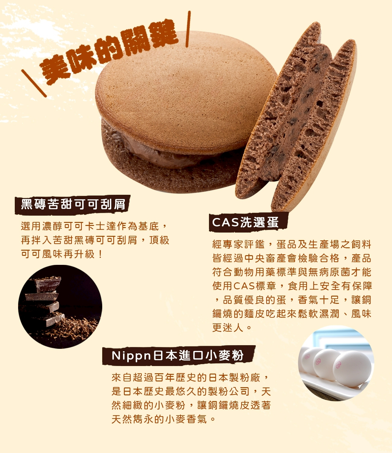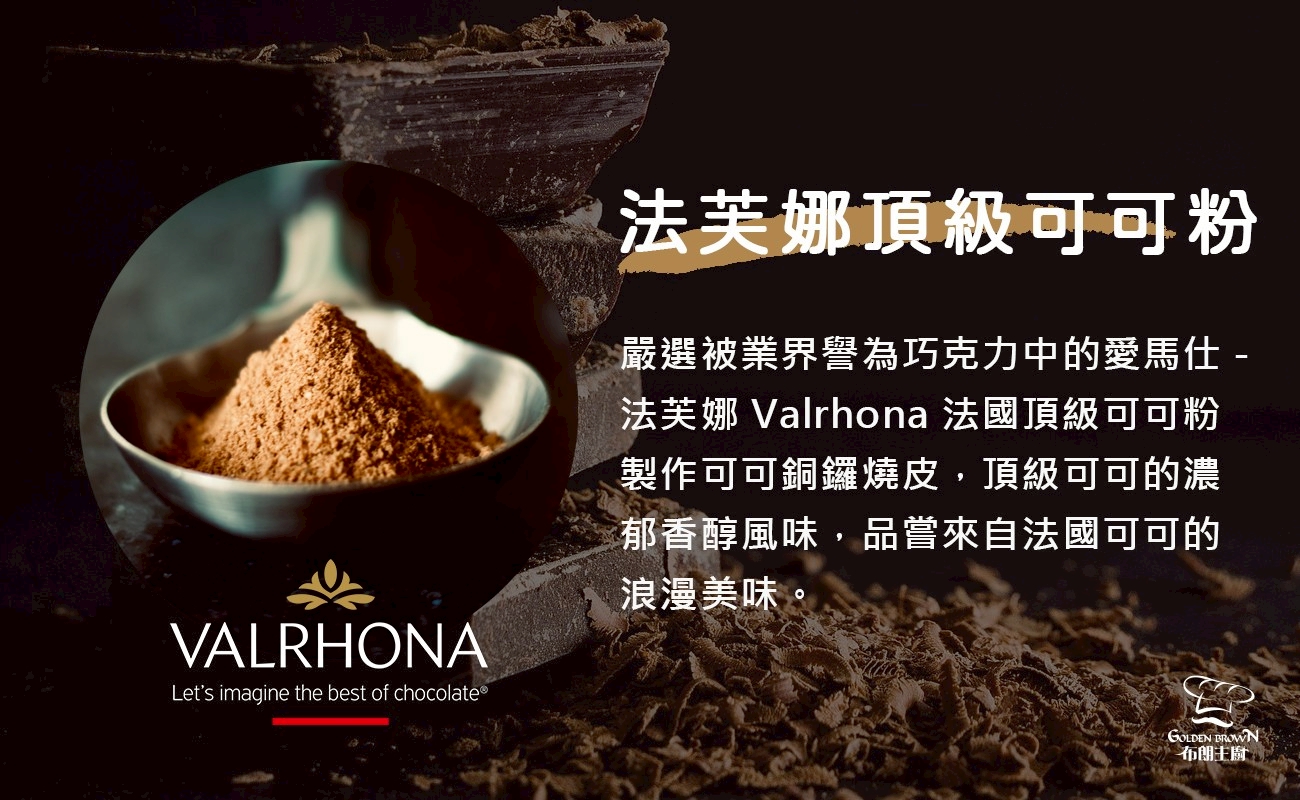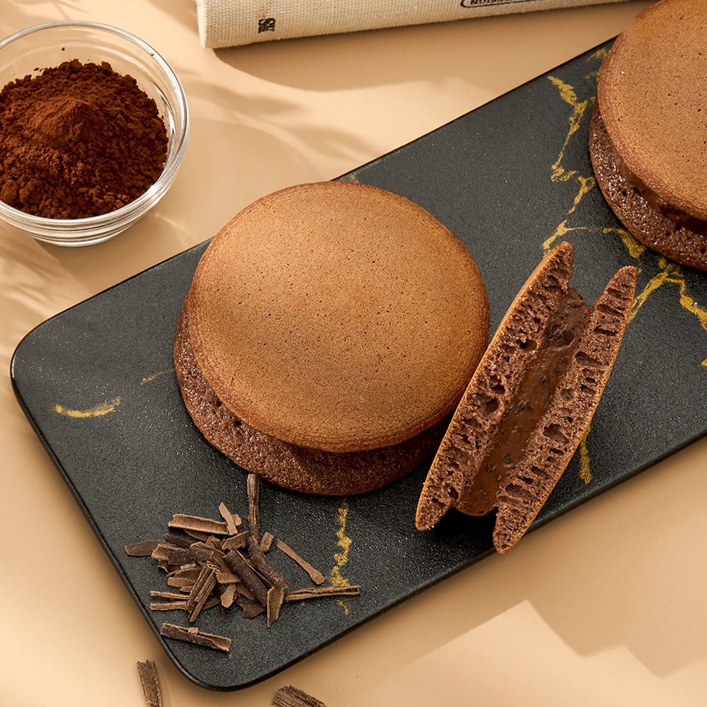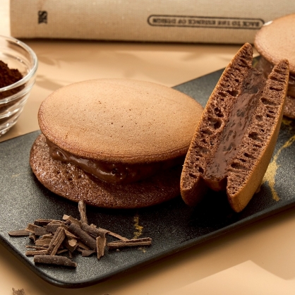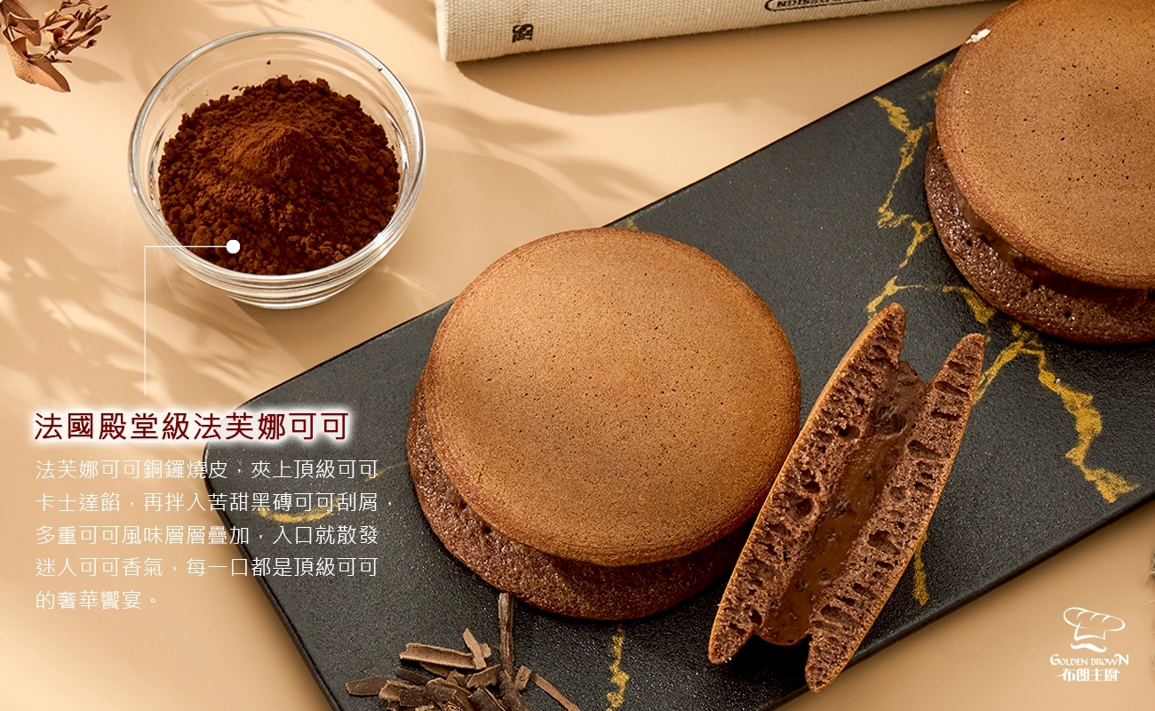 嚴選頂級法芙娜可可製作而成的可可銅鑼燒皮,夾上頂級可可卡士達餡,再拌入苦甜黑磚可可刮屑,多重可可風味層層疊加,入口就散發濃郁迷人可可香氣,每一口都是頂級可可的奢華饗宴。