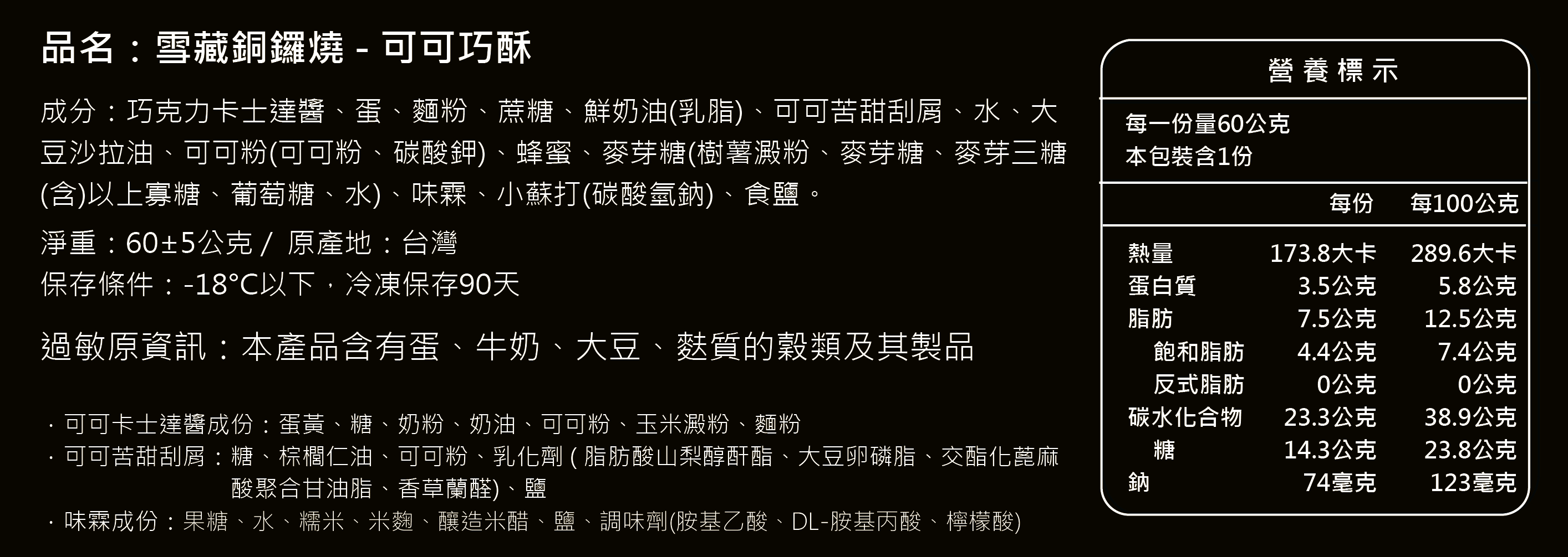 成分|麵粉、蛋、水、可可卡士達醬、鮮奶油、法芙娜可可粉、苦甜可可刮屑、蔗糖、麥芽精、蜂蜜、大豆沙拉油、小蘇打、鹽